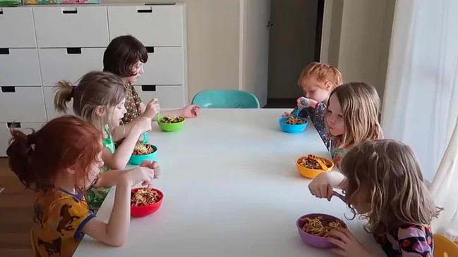 När barnen har städat, kl. runt 18.00 när det är dags för middag. Barnen samlas runt bordet där de äter sin middag. Det är dock bara vid ett fåtal tillfällen som Chloe och hennes man hinner äta med dem.