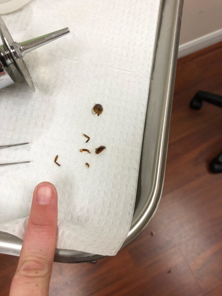 Och hos hans egen läkare kunde de konstatera att det fortfarande fanns delar av kackerlackan kvar i örat, och här kunde läkaren skölja öronen och ändå ta bort sex delar av djuret med pincetten – nio dagar efter ursprungliga resan till sjukhuset. Hon fick en tid hos en öronspecialist och här kunde mannen konstatera att ’det var något där inne’.