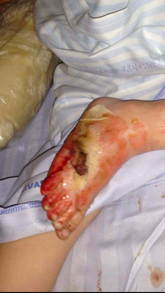 Pojken brände sig så illa på fötterna att han nästan tappade tårna, på grund av andra strandbesökares ignorans.