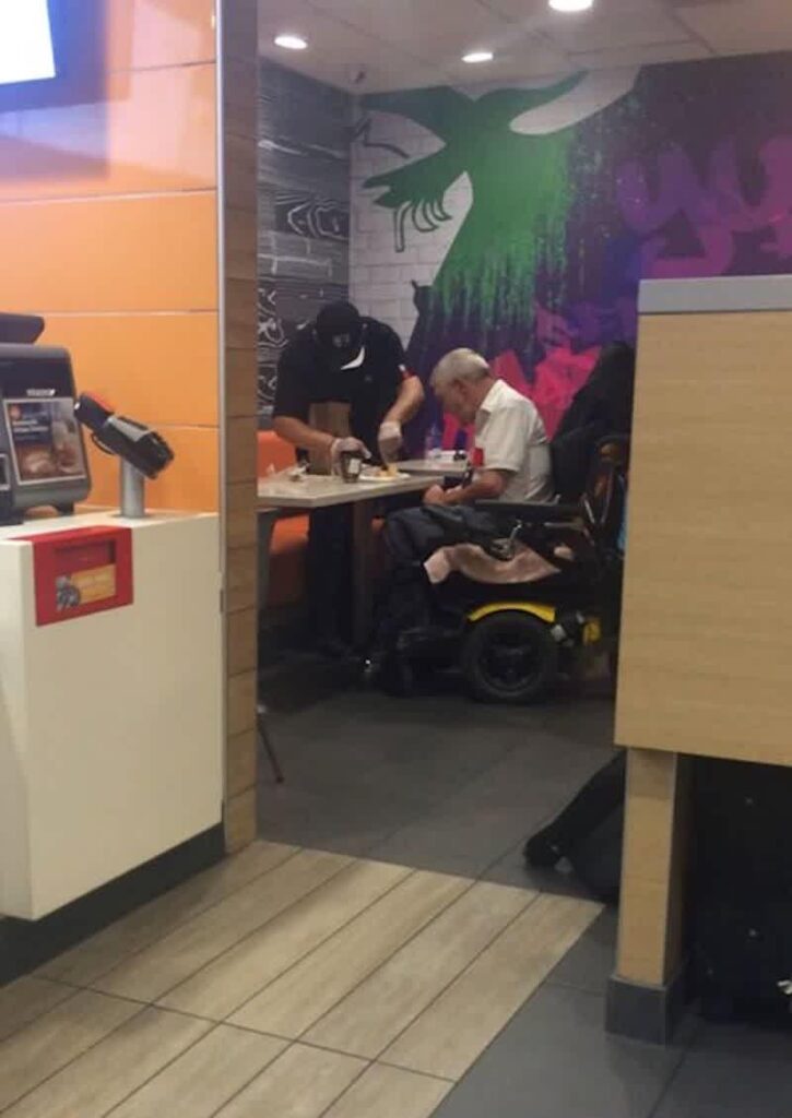 ”Mannen frågade artigt något till expediten, och det tog några försök för någon av oss att förstå att han sa ”Hjälp mig.” Ingen av oss visste vilken typ av hjälp han behövde, och expediten föreslog några saker, innan han kom på att den äldre mannen behövde hjälp med att skära ut sin måltid och äta den”, förklarar hon, enligt mediet LittleThings.