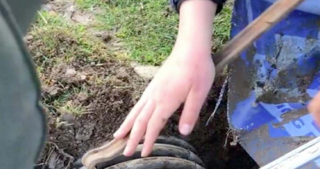 Först grävde familjen bort jorden, blottade röret – använde sedan en kofot för att få upp röret.
