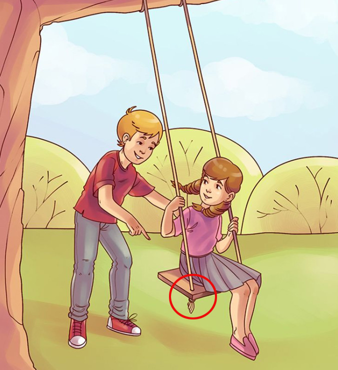 De flesta fokuserar på barnen eller hur gungan är hängd. Och gungan ligger i svaret nämligen – men inte hur den är upphängd. Det är snarare hur den är knuten nedtill nämligen. Om repen hade varit placerade på detta sätt så sitter flickan åt fel håll och gungar, eftersom hon egentligen skulle ha ramlat bakåt och åkt av gungan på detta sättet!