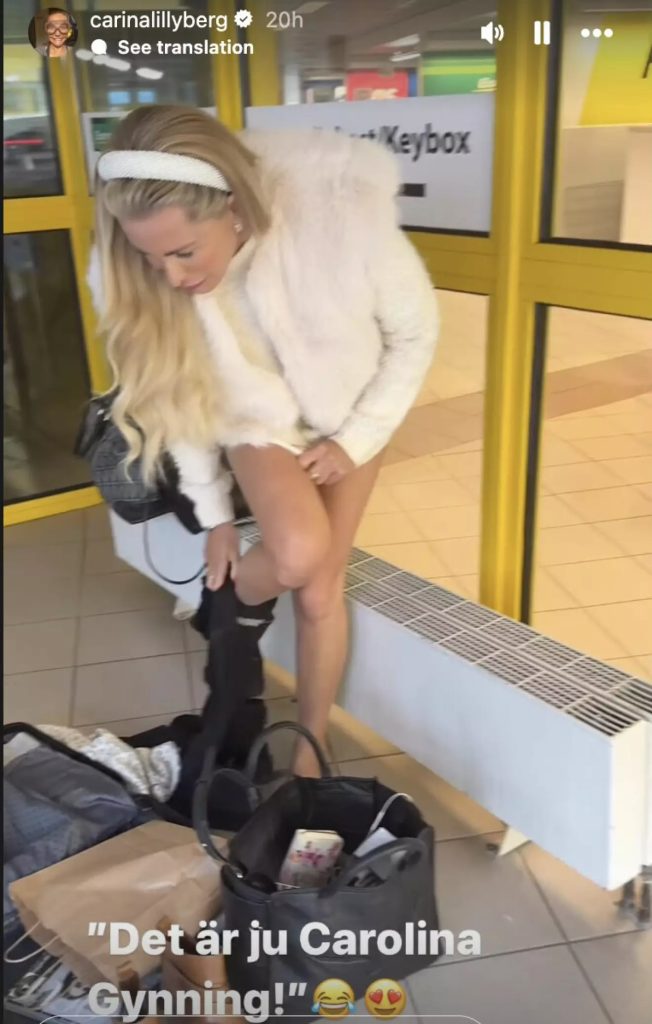Situationen uppstod när Carolina plötsligt insåg att hon behövde ta av sig sina strumpbyxor. Men istället för att smyga iväg till ett omklädningsrum valde hon att göra det rakt framför biluthyrningen – mitt bland folk. Carina Berg, som fångade situationen på film, hörs skratta i bakgrunden och kommentera den oväntade scenen.