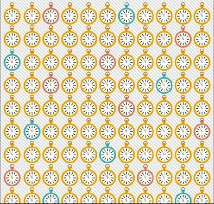 Här kommer det andra testet. Nedan ser du en bild på många klockor. En av klockorna sticker ut genom att den visar en annan tid än de andra. Kontrollera om du kan göra detta på under 18 sekunder: