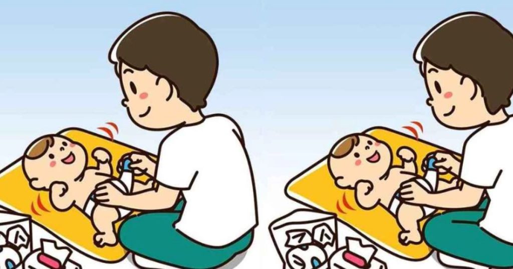 De här tecknade bilderna visar en pappa som byter blöja på sin bebis. Men kan du se vad som skiljer dem åt?