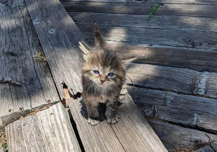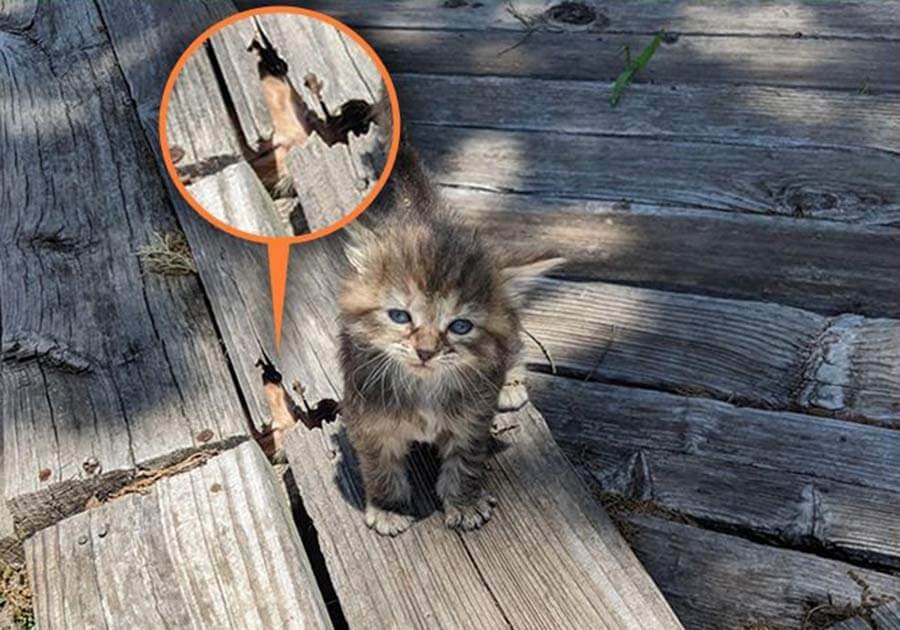 Väl gömt under golvbrädorna ser vi huvudet på en härlig liten kattunge.
