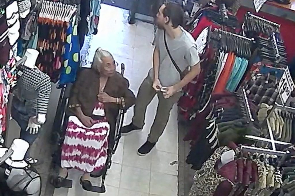 På bilderna från övervakningskamerorna ser man Maria Vasquez assistent, Felicia Reyes, försöka trösta den äldre kvinnan.