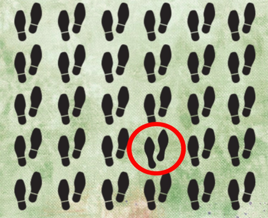 Testet nedan handlar om att öva sin skarpa blick. Bland 30 skoavtryck finns ett som är annorlunda. Det sägs att endast 1 av 7 lyckas hitta det unika avtrycket inom 10 sekunder.