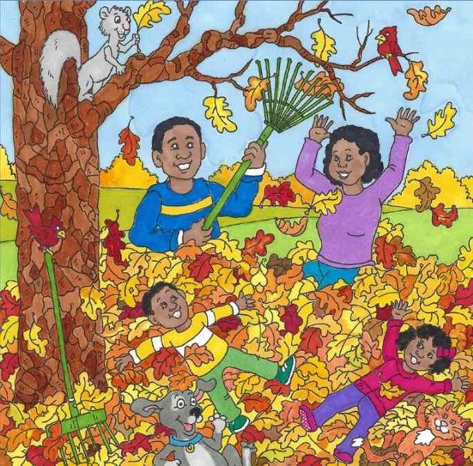 I denna livliga scen, fördold under fallande löv och en flitig familj, gömmer sig en listig orm som du måste upptäcka.