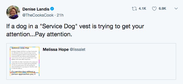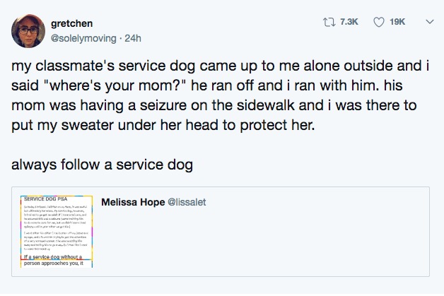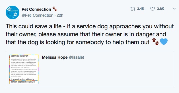 Hon skriver i meddelandet på Twitter att om en tjänstehund söker sig på egen hand så är det för att ägaren behöver hjälp. Detta är vad hunden är tränad att göra. Melissa skriver i inlägget att även om det inte var någon fara på väg den här gången kunde det ha varit mycket värre.