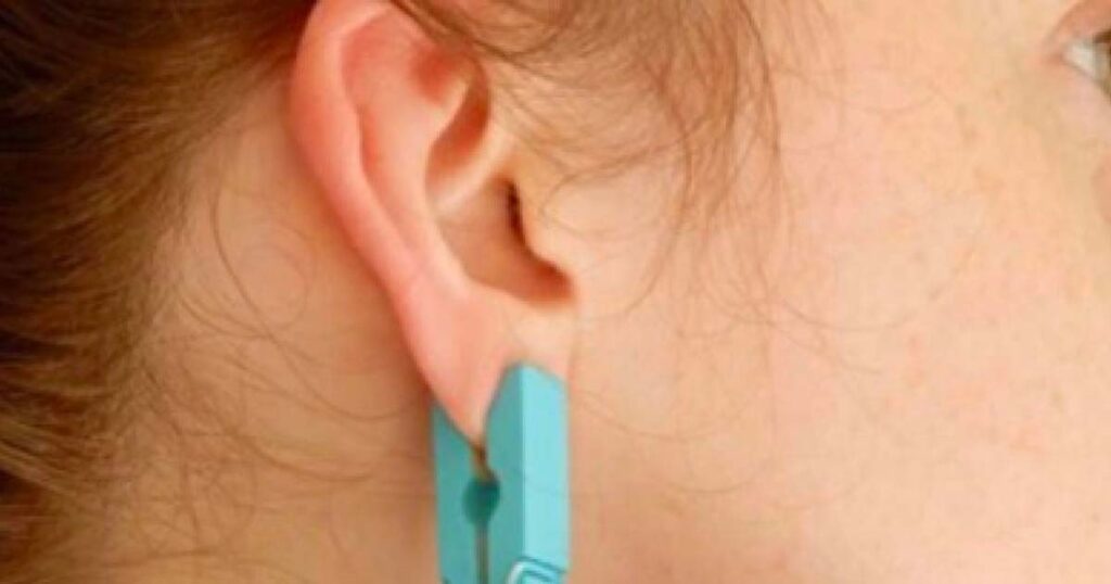 ”Varje öra innehåller en komplett karta över kroppen inklusive nervändar och kopplingar till det centrala nervsystemet”, är hennes förklaring till det enkla tricket att sätta klädnypor på öronen.
