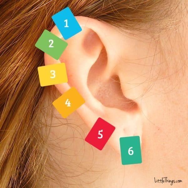Var och en av dessa sex punkter på örat är förknippade med smärta och ömhet på olika ställen på kroppen. Genom att sätta press på punkterna kan du lindra smärtan på den givna platsen.