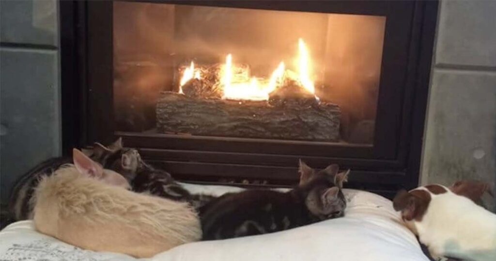 Ett magiskt ögonblick, här njuter detta gäng, 4 katter och 2 hundar, av värmen framför brasan efter en lång dag ute.