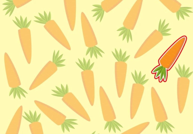 Utmaningen går ut på att identifiera den enda moroten som avviker från mängden, bland en rad till synes identiska morötter på en gul bakgrund.
