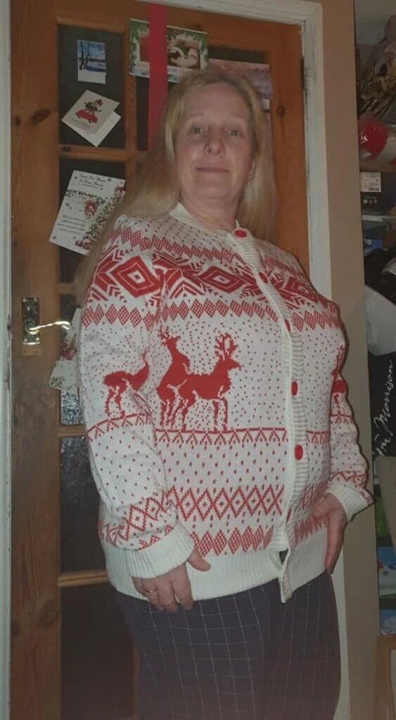 Carolyn Hallam, 53, från Nottingham i England köpte sin festliga rendräkt från en rea i hennes hemstad och var exalterad över att visa upp den.