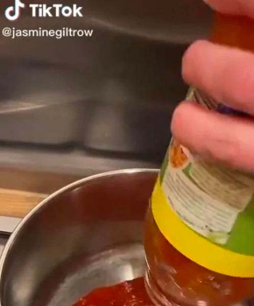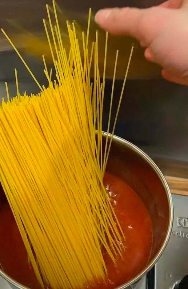 Klippet, som ursprungligen delas av TikTok-användaren @jasminegiltrow , visar en kvinna som häller en burk tomatsås i en gryta på sin spis. Sedan tillsätter hon lite vatten, varefter hon stoppar ner en näve spagetti i grytan.