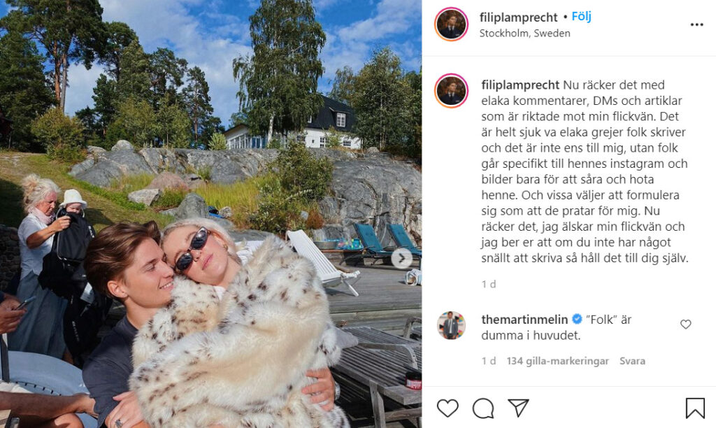 ”Nu räcker det med elaka kommentarer, DMs och artiklar som är riktade mot min flickvän. Det är helt sjuk va elaka grejer folk skriver och det är inte ens till mig, utan folk går specifikt till hennes Instagram och bilder bara för att såra och hota henne. Och vissa väljer att formulera sig som att de pratar för mig. Nu räcker det, jag älskar min flickvän och jag ber er att om du inte har något snällt att skriva så håll det till dig själv”, skriver han på Instagram.