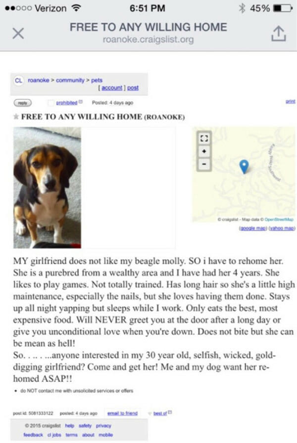 Så… är någon intresserad av min 30-åriga, själviska, onda, pengafixerade flickvän? Kom hit och hämta henne! Jag och min hund vill ha ett nytt hem åt henne SÅ FORT SOM MÖJLIGT!”