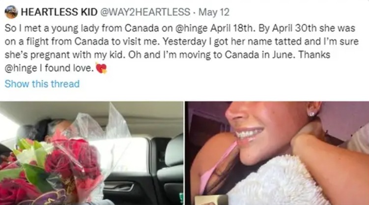 De två ”träffade” varandra på dejtingappen ”Hinge” den 18 april 2021, och det var tydligen kärlek vid första ögonkastet.
