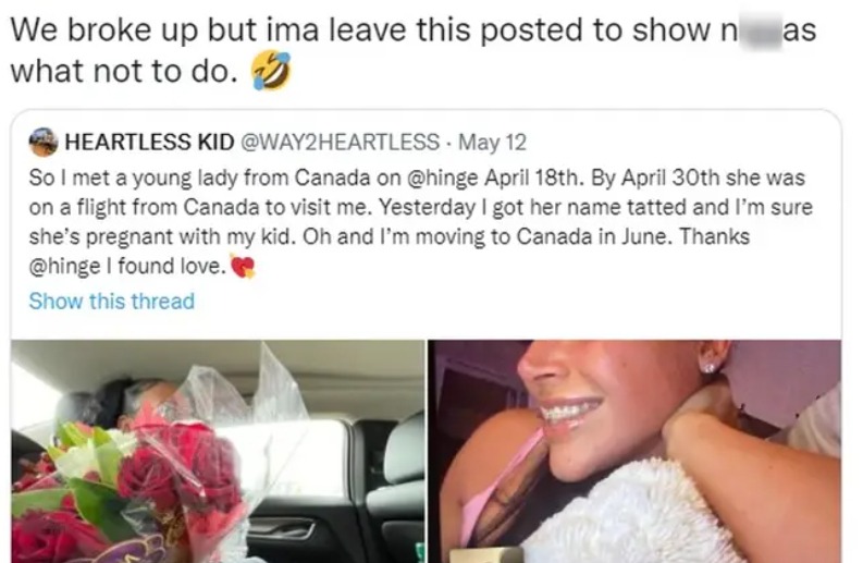Den 15 juni skriver Terrance följande på Twitter: ”Vi gjorde slut, men jag lämnar inlägg för att visa vad man inte ska göra [skratt emoji].”
