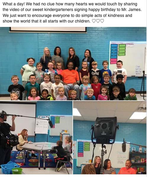 Videon som lagts upp av skolan på Facebook visar hur James går in i klassrummet och förskolebarnen börjar sjunga och gestikulera. Vaktmästaren är tydligt berörd av barnens söta och underbara gest.