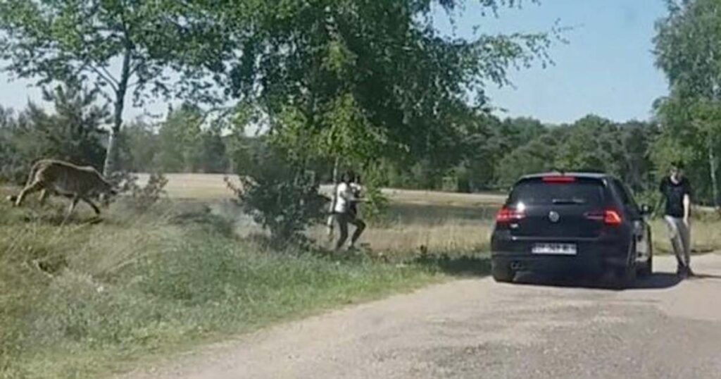 Videon som spelades in i våras i en safaripark i Nederländerna visar hur en familj med små barn lämnar bilen under sitt besök i parken.