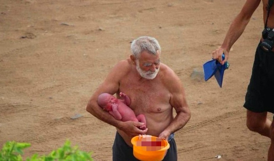 Enligt fotografen Hadia Hosny El Said, som chockerande fångade hela affären på kamera från balkongen på hennes hotellrum, var den äldre mannen en förlossningsläkare som var tvungen att assistera föräldrarna under den blöta förlossningen.