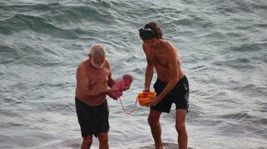 Kort efter att de unga föräldrarna gått i vattnet kom pappan upp igen, men han var inte ensam. I sina händer bar han ett litet spädbarn, som modern just fött i havet.