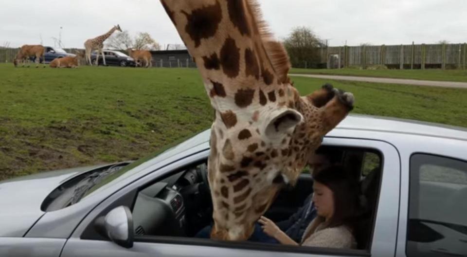 En bilist fick en rejäl chock när en giraff stack in hela huvudet i bilen under ett besök på den lokala djurparken.