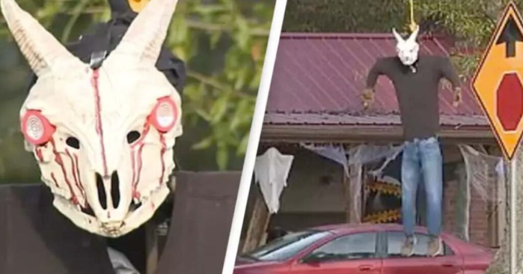 Dekorationen, som fanns ute i Cartersville i Bartow County nära Atlanta, består av en ’kropp’ med en falsk bagge- eller getskalle som huvud och ficklampor för ögon, som har hängts upp i ett träd i halsen.