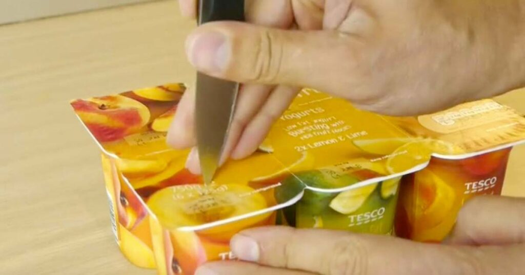 1. Skär ett hål i locket på yoghurten med en kniv.