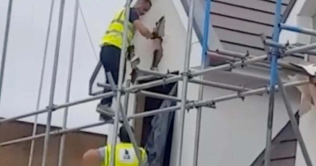 Videofilmen på TikTok visar arbetaren stå på ställningen och använda en hammare för att riva ner sitt arbete, medan kollegor försöker lugna ner honom.