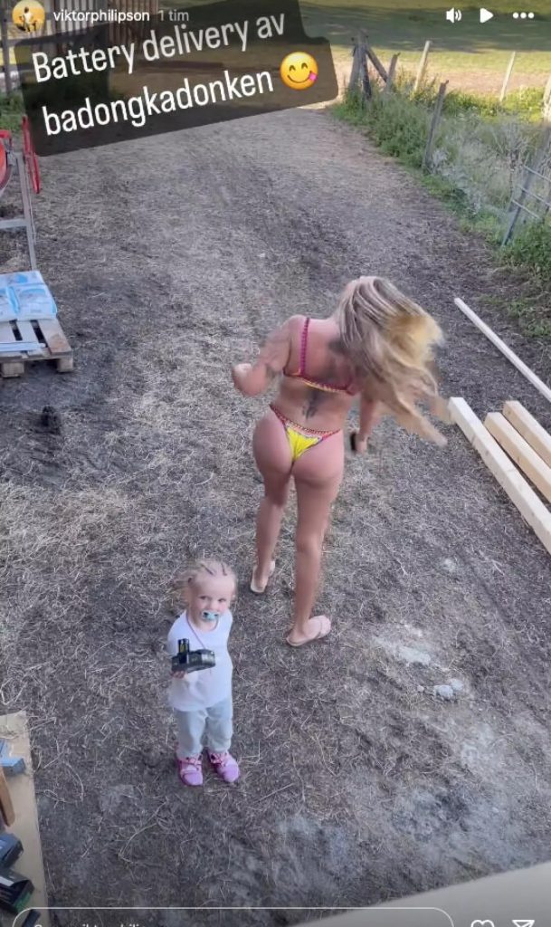 Kanske är det just tävlingen om sommarens brunhet som gör att Carolina gärna visar sig i bikini på gården. I en nyligen upplagd video på Instagram, visar Viktor när han snickrar på taket. Plötsligt filmar han hur dottern kommer för att lämna ett batteri till honom, följt av Carolina som poserar i bikini framför honom.