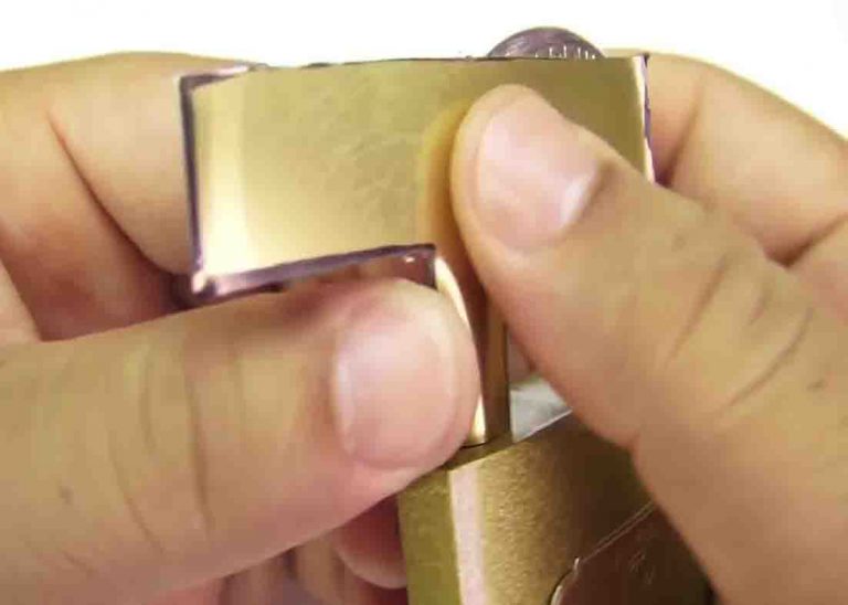 Ta ett plåtlock, rita en form av ett ”T” och klipp sedan till det. När du har klippt, lindar du detta runt handtaget på hänglåset och för sakta in spetsen i insidan av handtaget. Vänd det runt och hänglåset kommer att öppnas upp.