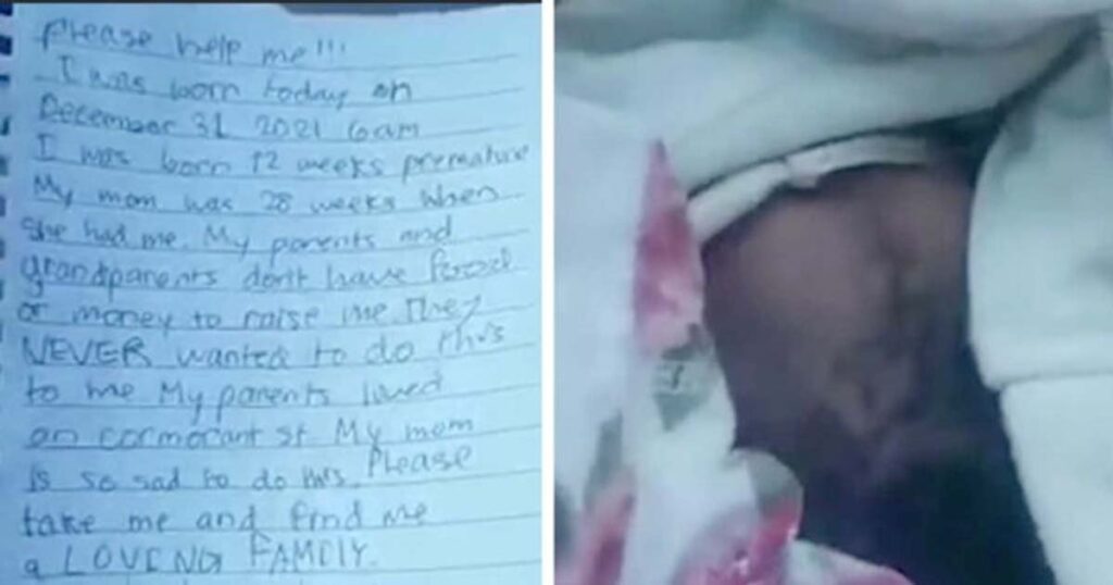 Jag föddes idag den 31 december 2021 (kl.) 06.00. Jag föddes 12 veckor för tidigt. Mina föräldrar och morföräldrar har varken mat eller pengar att uppfostra mig. De skulle ALDRIG göra så här mot mig”, står det i lappen.