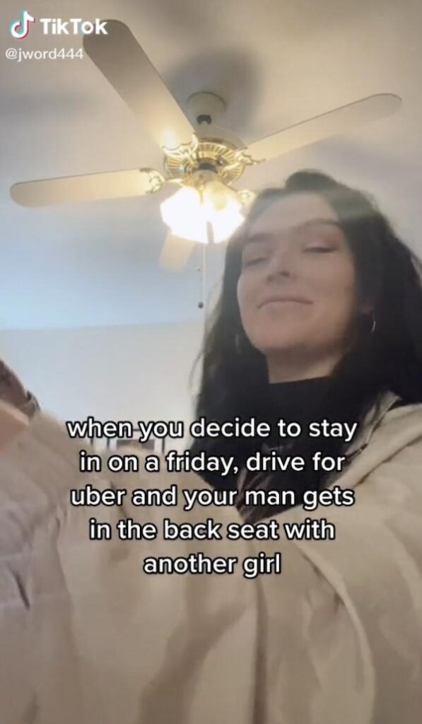 ”När du bestämmer dig för att inte gå ut på fredag, för att köra Uber, och din man sätter sig i baksätet med en annan tjej”, skrev hon under rubriken till sin video.