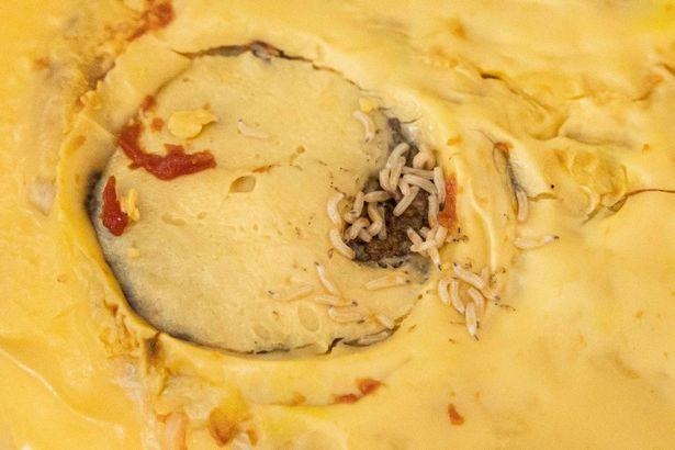När hon öppnade sin dubbla cheeseburgare flög en fluga ut och när hennes syster tog en titt inuti hamburgaren kunde hon se att det fanns flera kvalster.