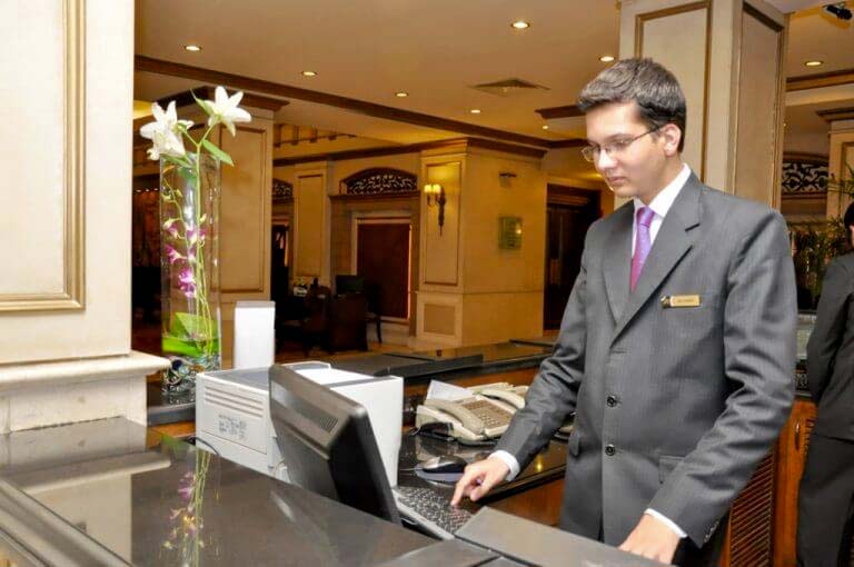 Några minuter senare kommer chefen ut. Han lyssnar på mannens klagomål om för dyrt pris, men förklarar sedan om alla hotellets faciliteter. Vi har en stor simbassäng, och ett stort konferenscenter du också kunde ha använt under besöket.