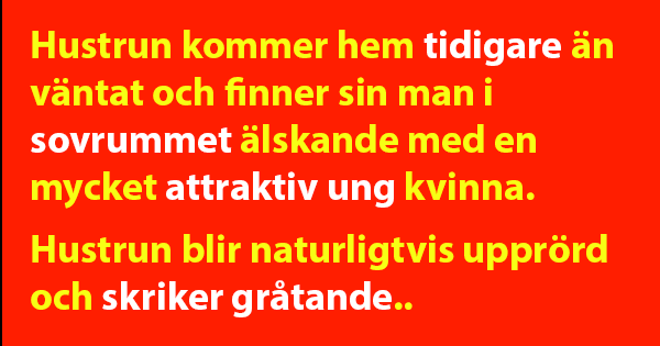 Hustrun kommer hem tidigare än väntat och finner sin man i sovrummet älskande med en mycket attraktiv ung kvinna.