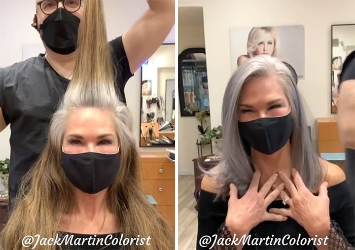 Den här skickliga frisören har tänkt annorlunda och går in för att framhäva det vita och gråa håret för sina kunder, så att de blir bekvämare med den silverfärg som ligger nära deras naturliga hårfärg.