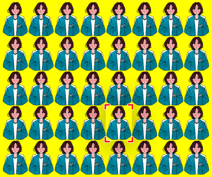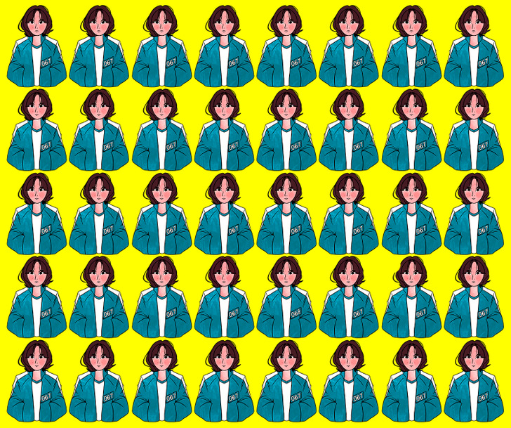 På bilden ovanför ser vi en massa bilder på samma tjej med en gul bakgrund. Vid en första anblick ser alla bilder identiska ut – men det finns faktiskt en detalj som sticker ut från mängden!