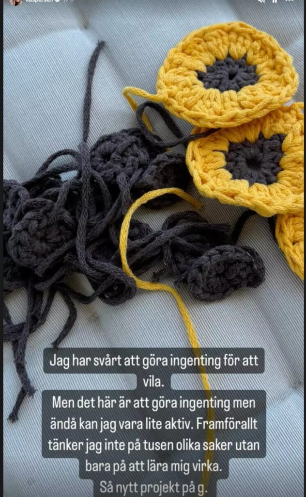 Kristin erkänner också att det är svårt för henne att inte ha något att göra. Men hon har hittat en ny hobby under sin återhämtning – att virka.