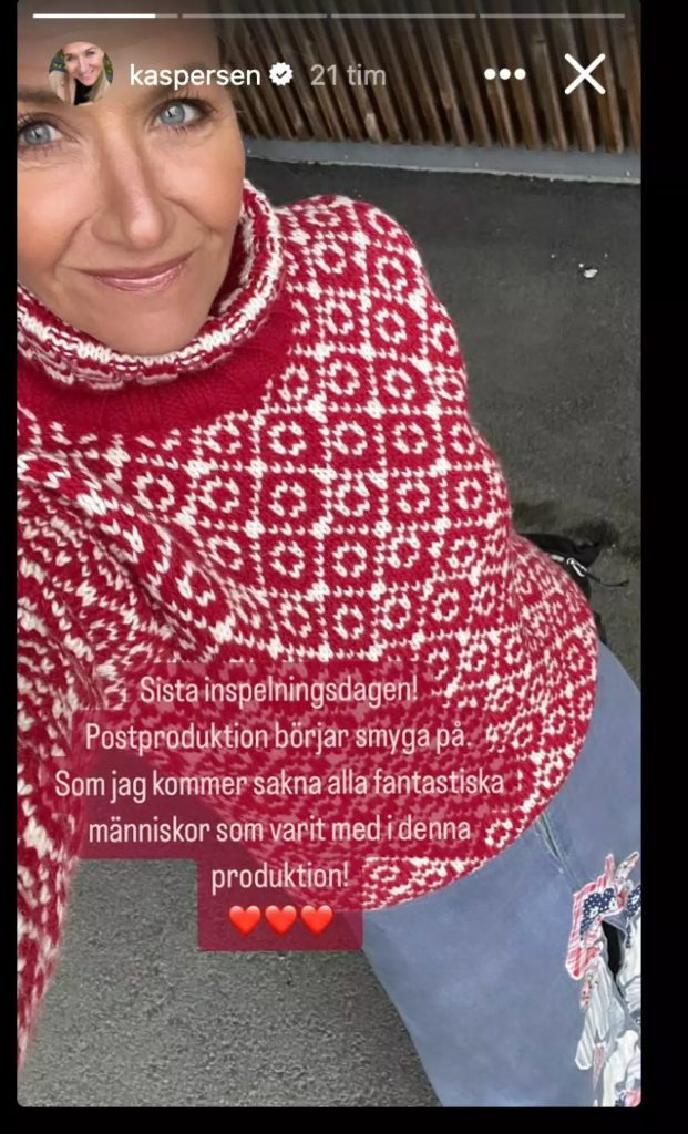 ”Sista inspelningsdagen! Postproduktion börjar smyga på. Som jag kommer sakna alla fantastiska människor som varit med i denna produktion!”, skrev Kristin tillsammans med tre röda hjärtemojis.