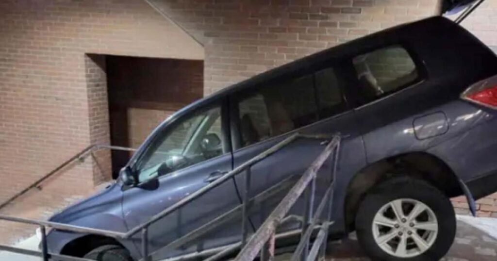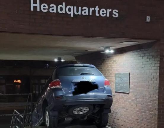 ”En 26-årig kvinnlig bilist körde genom polisens garage och över vårt övergångsställe. Hon försökte sedan köra ner för trappan till Middle Street”, skriver de och tillägger: