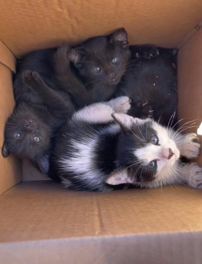 Inne i lådan låg fyra helt friska och glada små kattungar. Det fanns inga tecken på att kattungarna hade några hälsoproblem.
