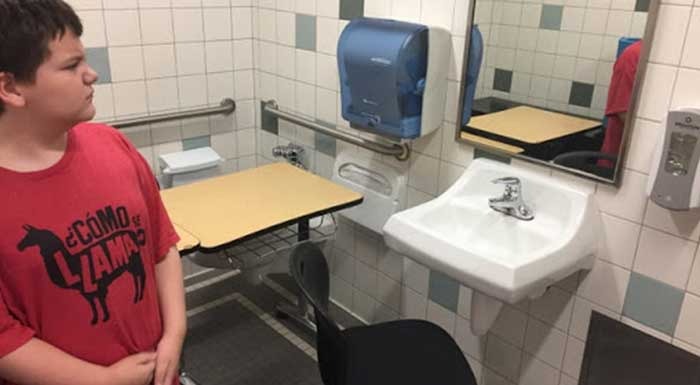 Elvaårige Lucas Goodwin var ganska missnöjd när han kom till skolan i delstaten Washington, USA, och upptäckte att hans skrivbord hade flyttats till en annan plats, på toaletten!