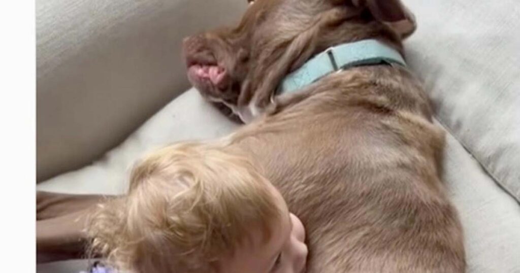 Den ettåriga flickan ses ligga i soffan med den stora hanen. Hennes mamma frågar om Nico får ge hunden en puss. Men vad som händer härnäst hade Emily inte förväntat sig.