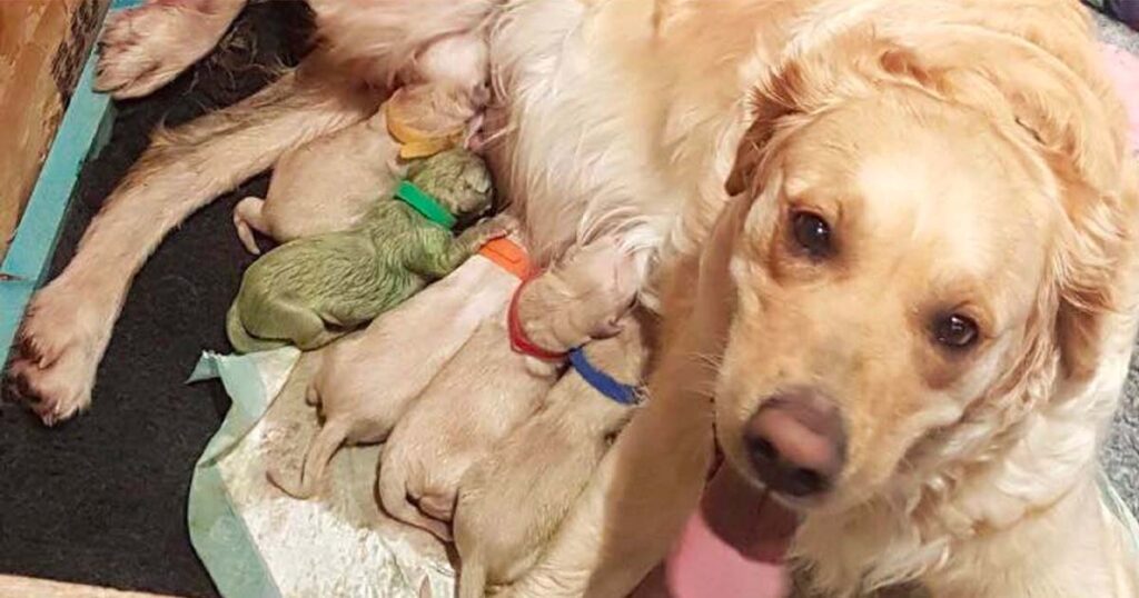 Louise Sutherland, som är ägare till den vuxna golden retriever som födde den lilla valpen, var dock långt ifrån förberedd. Hon trodde inte sina ögon när en grön valp föddes.