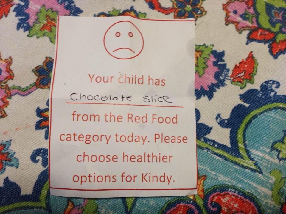 – ”Ditt barn tog med sig en bit chokladkaka från den röda matkategorin idag. Vänligen välj hälsosammare alternativ för dagis.
