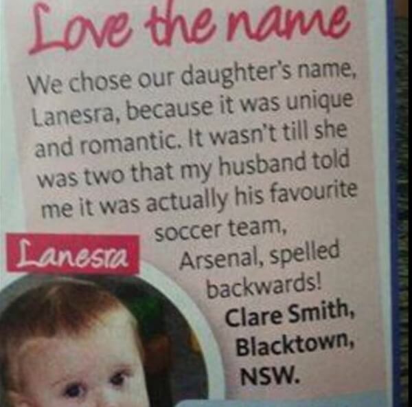 På tidningsurklippet ovan så står det: ”Vi valde vår dotters namn för att det var unikt och romantiskt. Det var inte förrän hon fyllde två som min man berättade för mig att det var hans favoritlag i fotboll, stavat baklänges!”